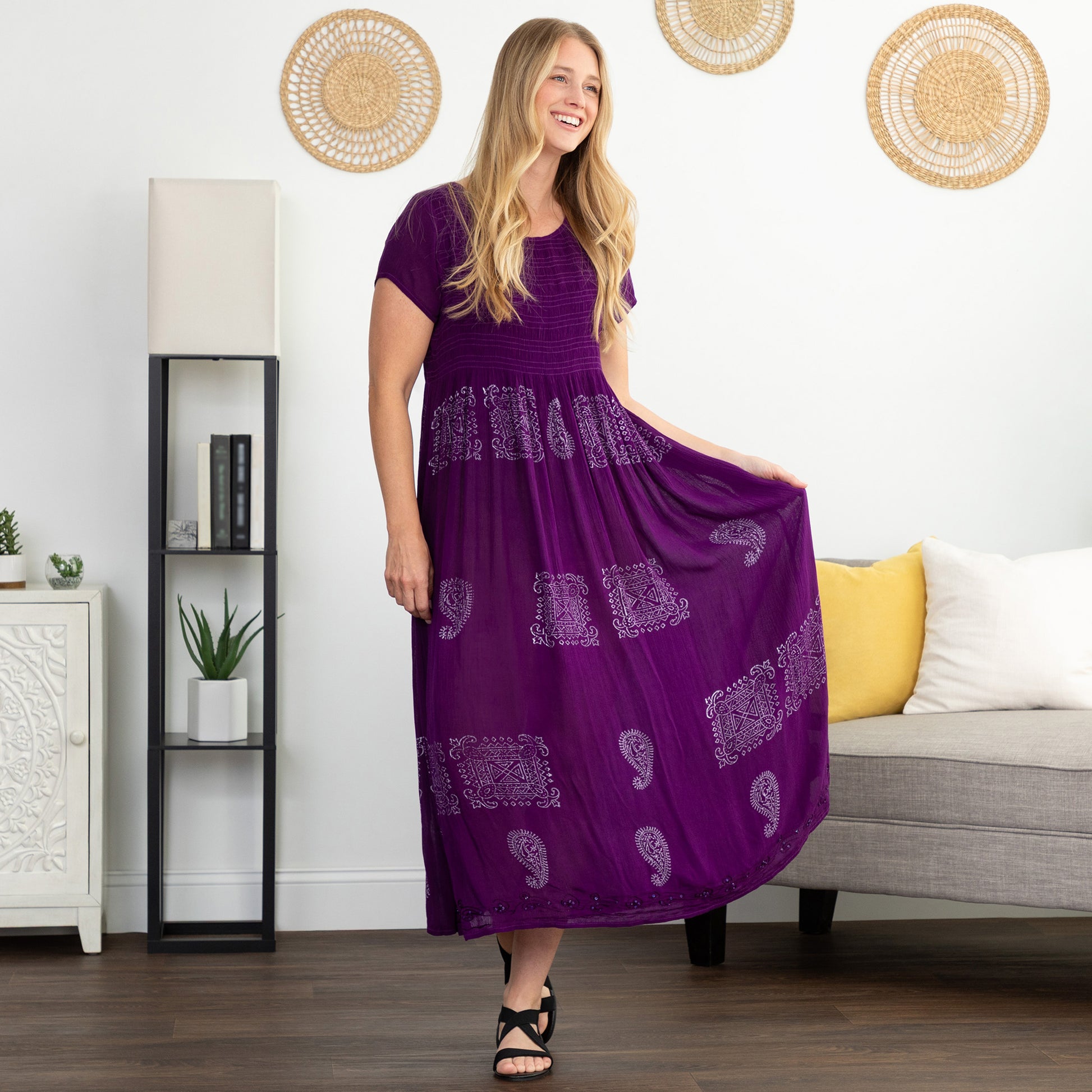 Breezy and effortlessly charming, this cap sleeve dress showcases a front-only, paisley-inspired print, thoughtfully handcrafted by skilled artisans in India through fair trade practices. Made from soft, lightweight rayon, it drapes with ease in a relaxed silhouette—perfect for sunlit days and spontaneous outings. Embroidered beading and detailing along the hem add an artful finish, making this globally inspired piece a beautiful fusion of comfort, character, and conscious craftsmanship.