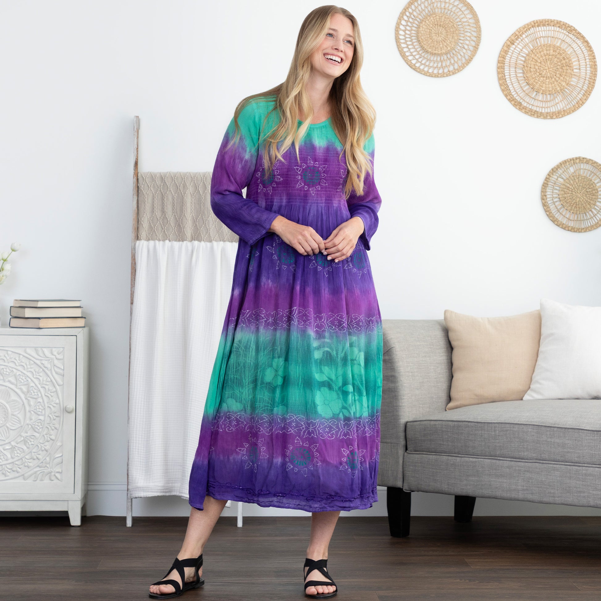 Crafted from 100% rayon, this airy midi dress is light as a breeze and made to move with you. The 3/4 sleeves strike just the right balance between comfort and elegance, while the flowing silhouette adds a graceful swish to every step. Whether you're out exploring or simply soaking up the moment, this dress is ready to go wherever the day takes you.