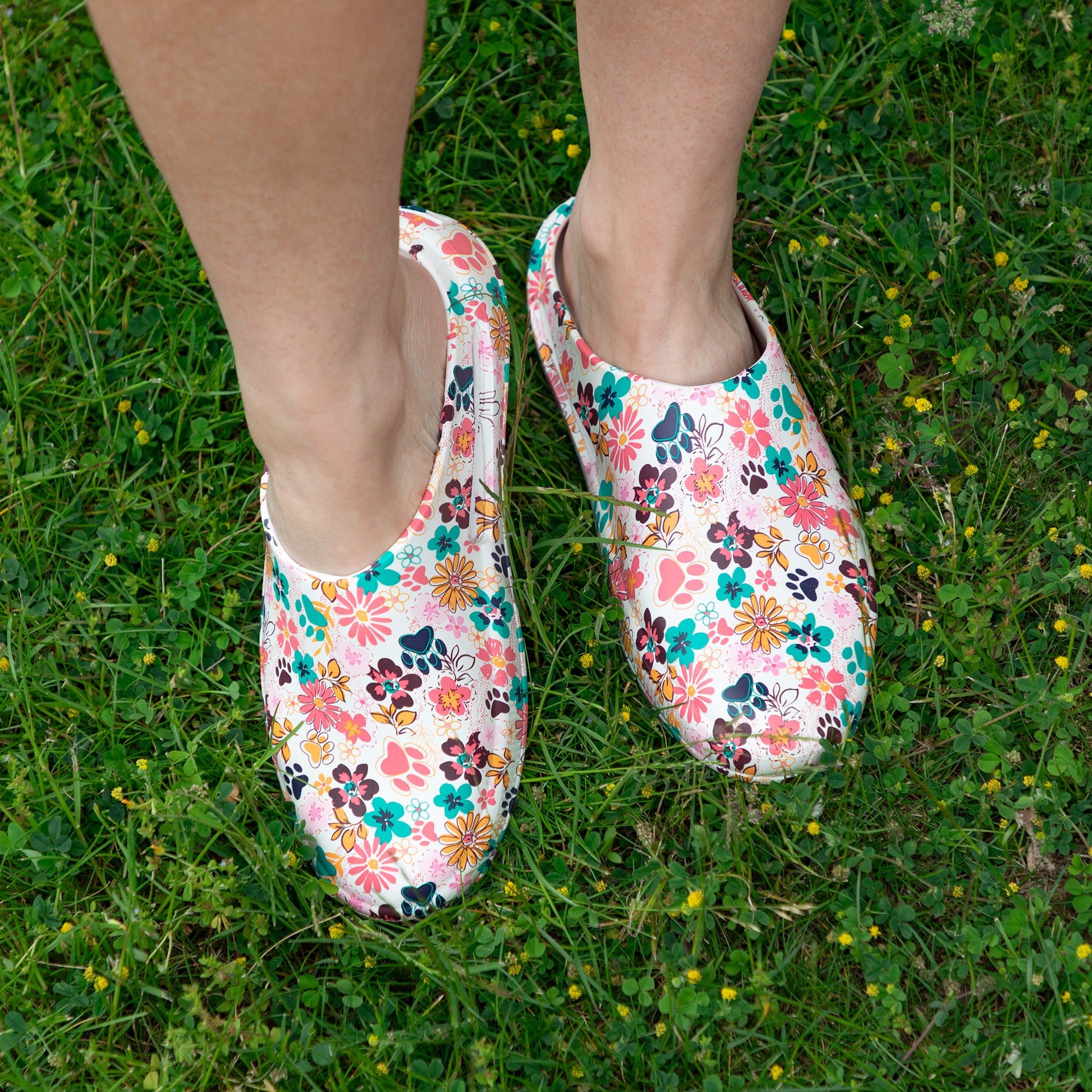 Brighten every step with these colorful slip-on clogs! Featuring a charming paw print and floral design, these ultra-light EVA clogs are perfect for effortless everyday wear. The slip-on style ensures convenience, while side ventilation holes keep your feet cool and comfortable. Whether you're strolling through the garden, running errands, or relaxing at home, these fun and functional clogs add a pop of personality to every stride!
