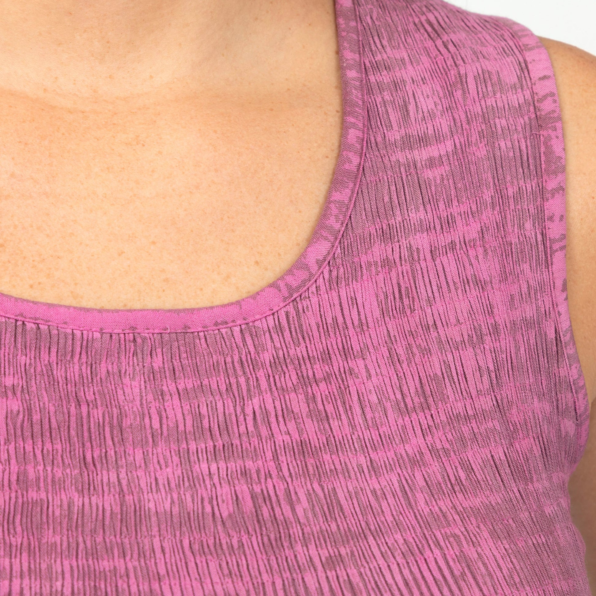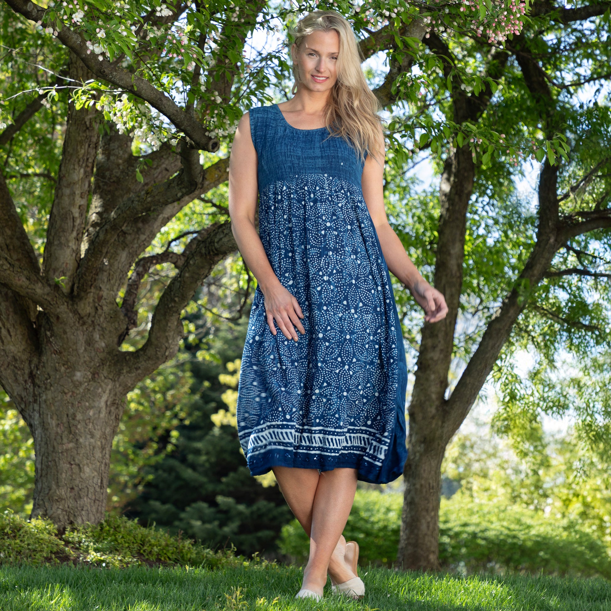 Rocking the mid-calf length, this dress is the perfect combo of chill and beautiful. The ruching adds flattering definition, hugging the bust with a soft texture and subtle detail. A hand printed tie-dye pattern brings a lively, eye-catching energy, while the sleeveless cut keeps the look fresh and breezy. Ideal for hot days or casual get-togethers, this dress effortlessly combines comfort, confidence, and bold style into one easy-to-wear piece.