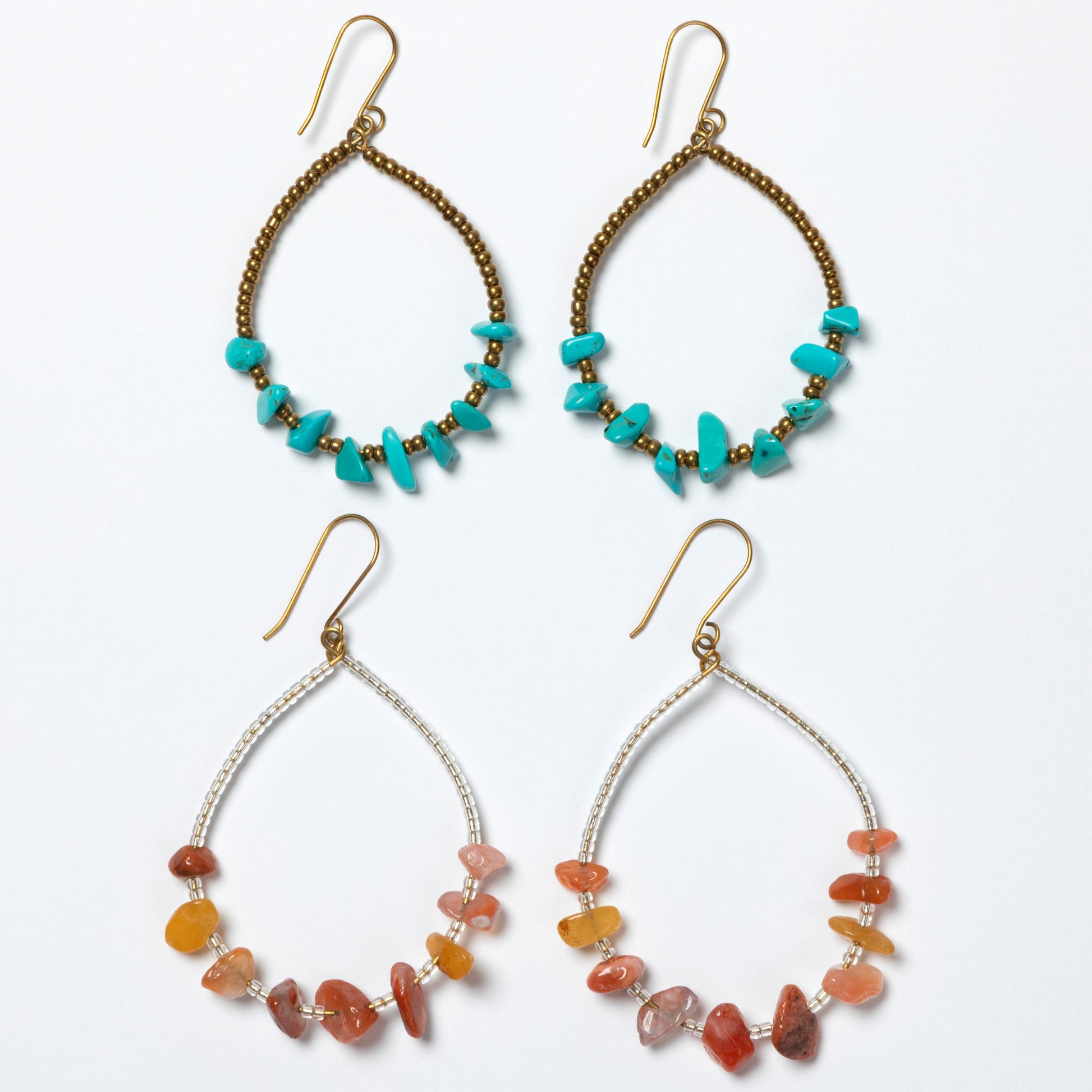 Add a vibrant, artisan-crafted touch to your look with these handmade stone hoop earrings. Each pair is hand-beaded in Kenya and features a beautiful mix of real stones and delicate beads. Choose from two unique designs—earthy Carnelian tones or bold Turquoise accents—each offering rich color and natural texture. Lightweight and eye-catching, they make a statement while remaining comfortable for everyday wear. Every pair is one-of-a-kind, reflecting the artistry and craftsmanship of the makers.