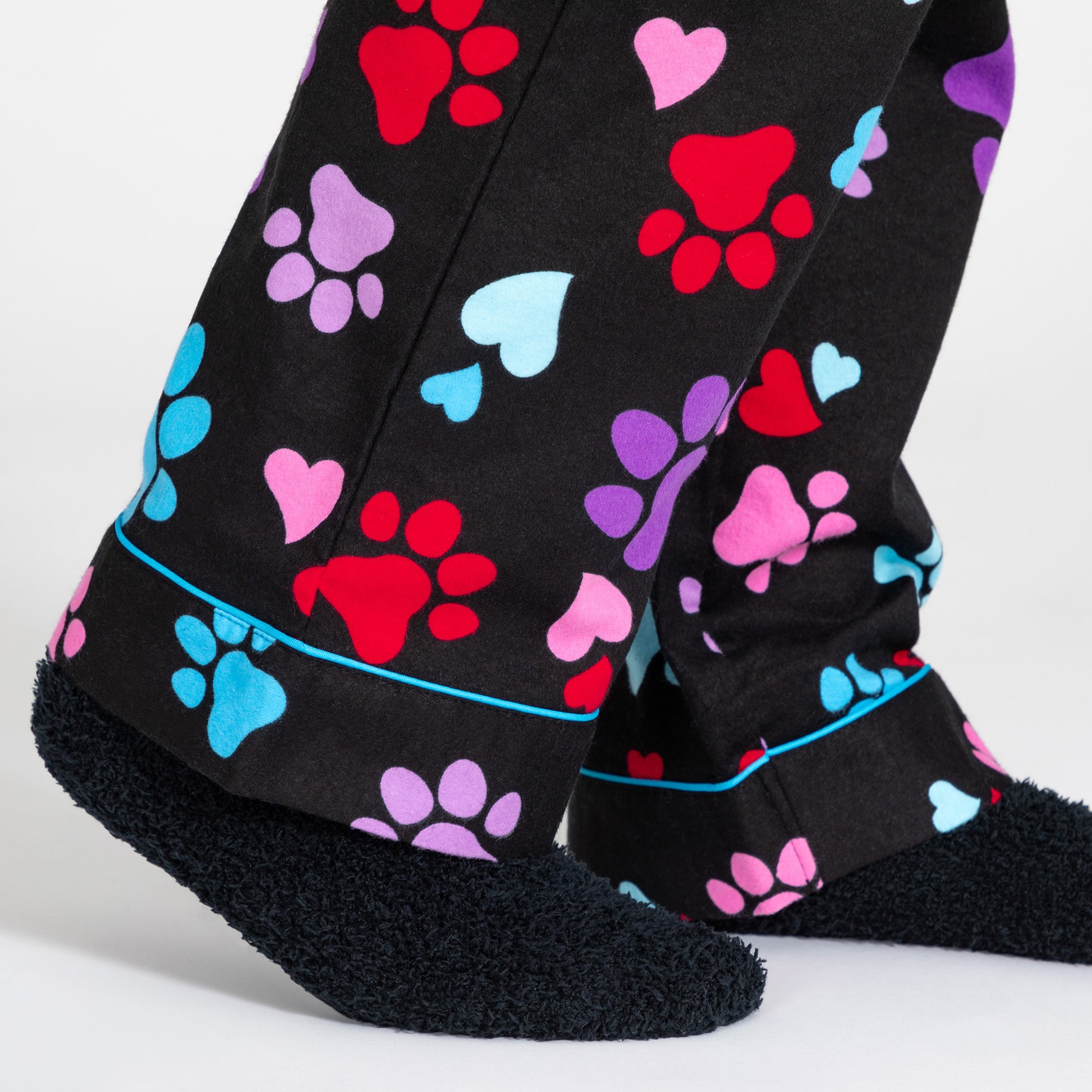 A classic pajama silhouette with furry friend flair! Featuring a button up design with a structured collar, and a comfortable drawstring waist that provides the ideal fit. This flannel pajama set is covered collar to cuff in an adorable paw print and heart design to carry you off to dreamland.