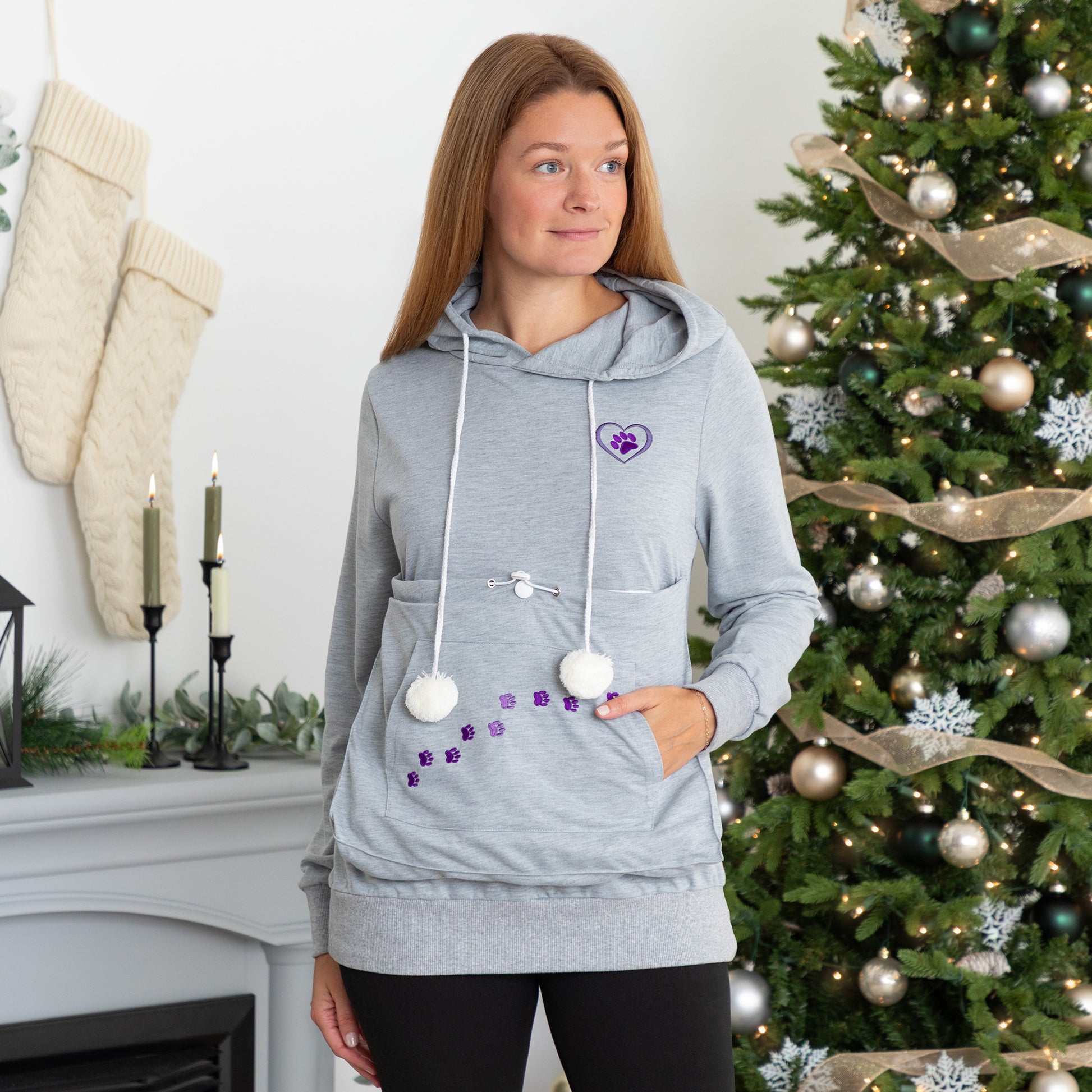 What could possibly be warmer than snuggling up with your beloved pet? How about snuggling with them inside a paw-speckled sweatshirt! Though it may appear like an ordinary lightweight, heather-gray hoodie, this clever piece boasts an extraordinary feature: an oversized front pouch perfect for carrying your cat or teacup breed pooch inside. The top-loading pocket has a zip-in, ultra-soft lining that's easily removable for cleaning, along with a drawstring to adjust for your and your pet's comfort, as well as a simple button for closure when empty. It also features classic favorites like a kangaroo pocket for your non-pet necessities and a hood -- complete with a yarn-ball style drawstring to keep your pet occupied during transit!