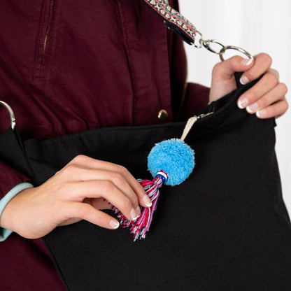 The basic black bag gets a fun twist with this cultural textile ribbon handle that's interchangeable with any fun straps of your own. You also get a purse fob that can be used as a key chain or tassel decoration. This bag is full of fun possibilities!