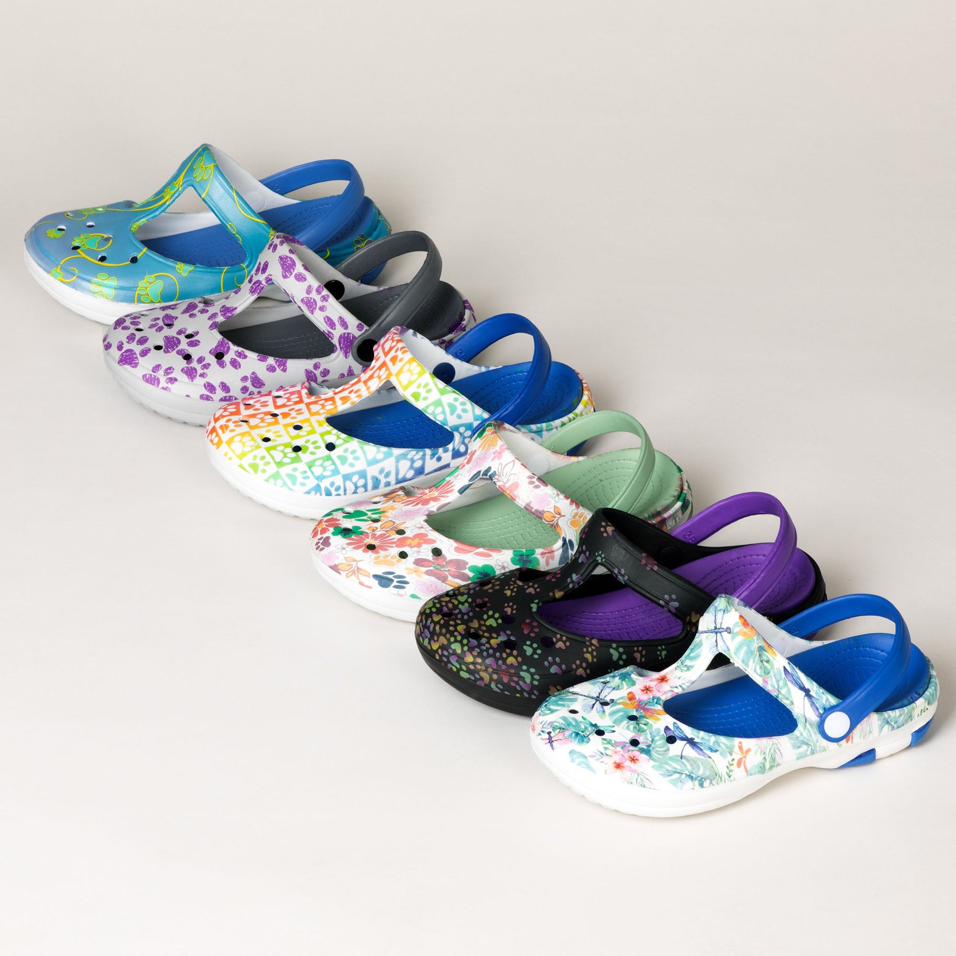 Cute with the unmistakeable mary jane design, this pair of lightweight clogs go flawlessly with the activities you and your furry friend have planned for the day! Patterned in paws of varying colors, or tropical design with butterflies or dragonflies, this easy pair of mary jane shoes features a textured insole and matching strap that can be worn over the top or behind the heel. Versatility and comfort combined!