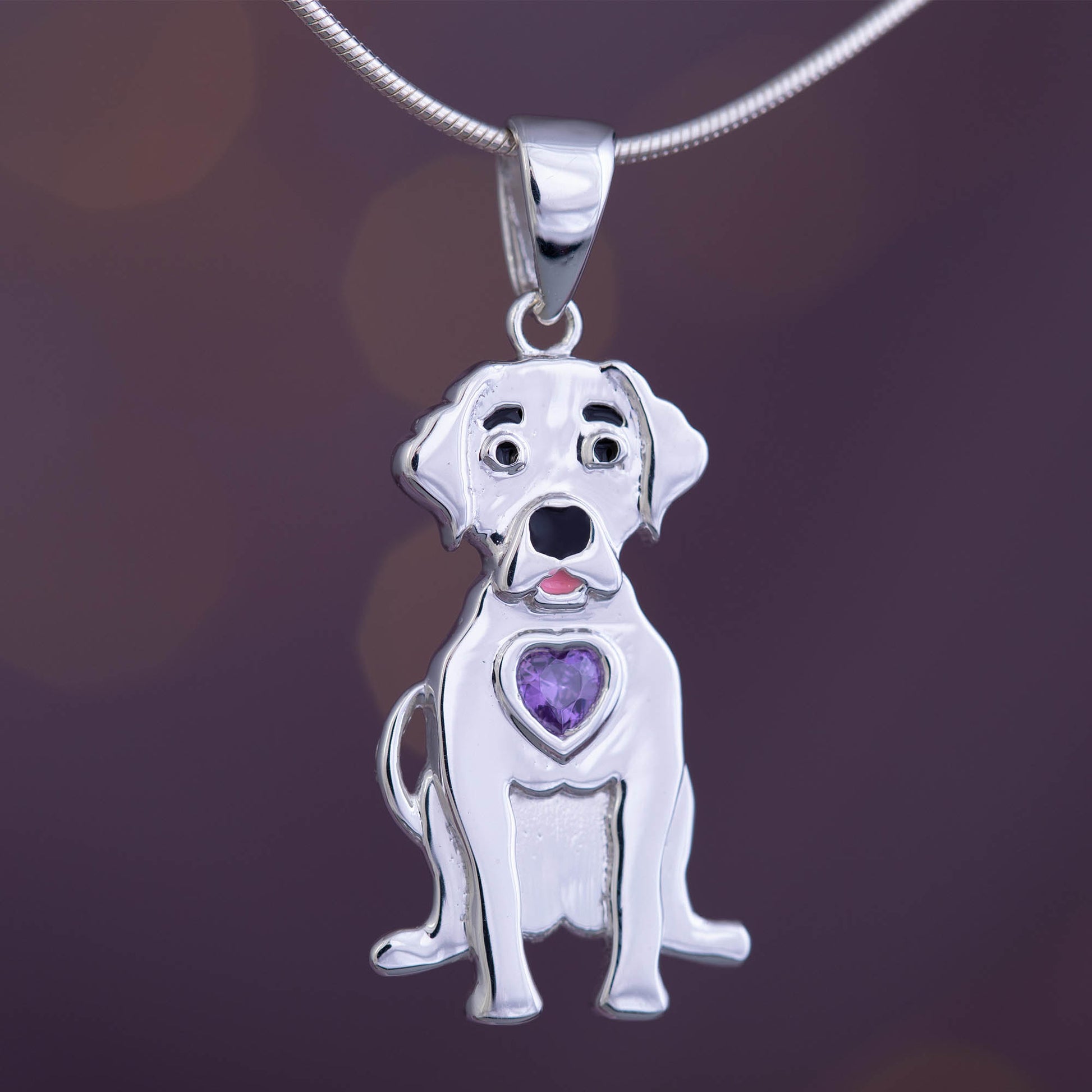 A sterling silver token of your passion for our furry friends. Handmade by artisans in Bolivia, this sterling silver pendant features a sweet sitting pooch with a purple crystal heart on its chest-- a true animal lover's accessory!