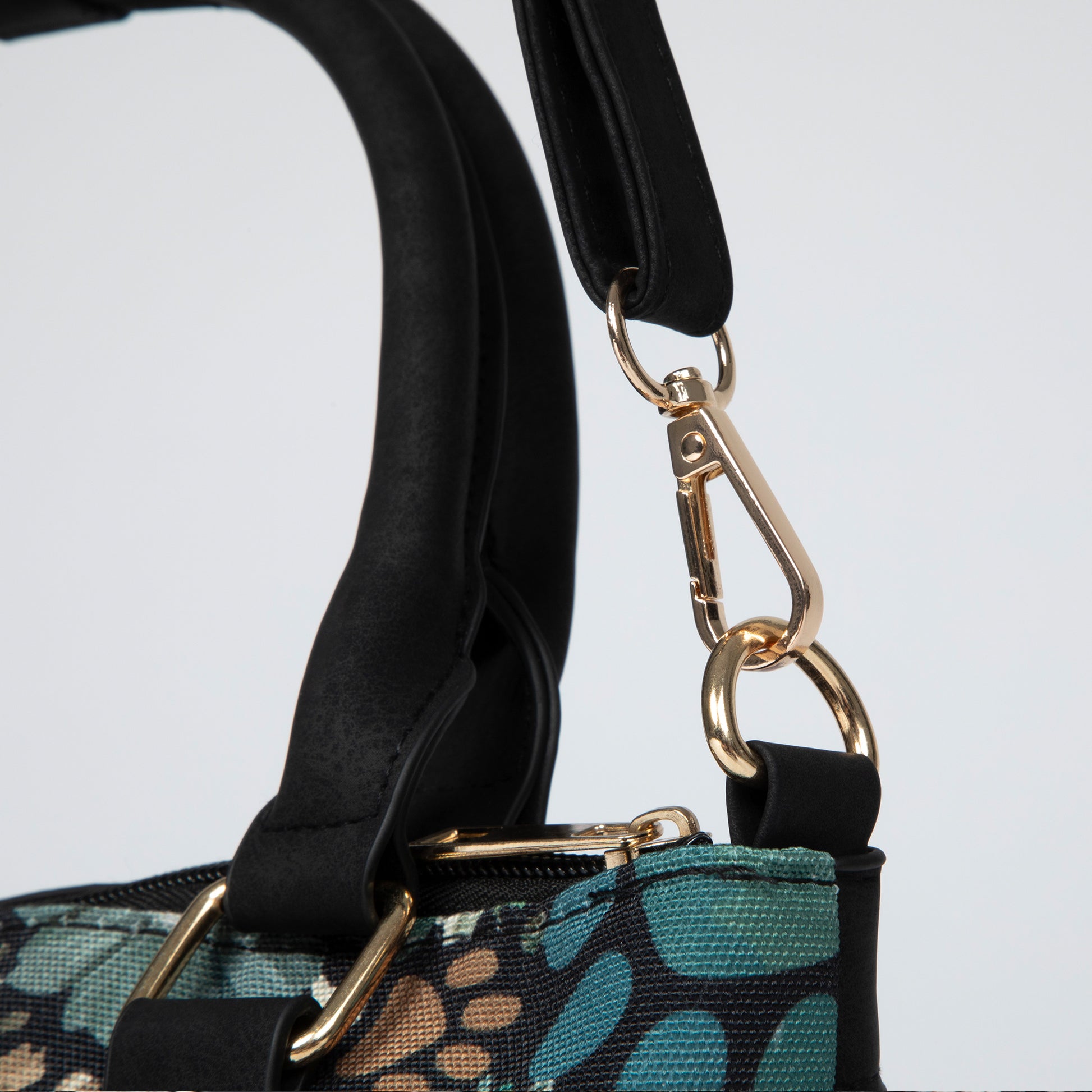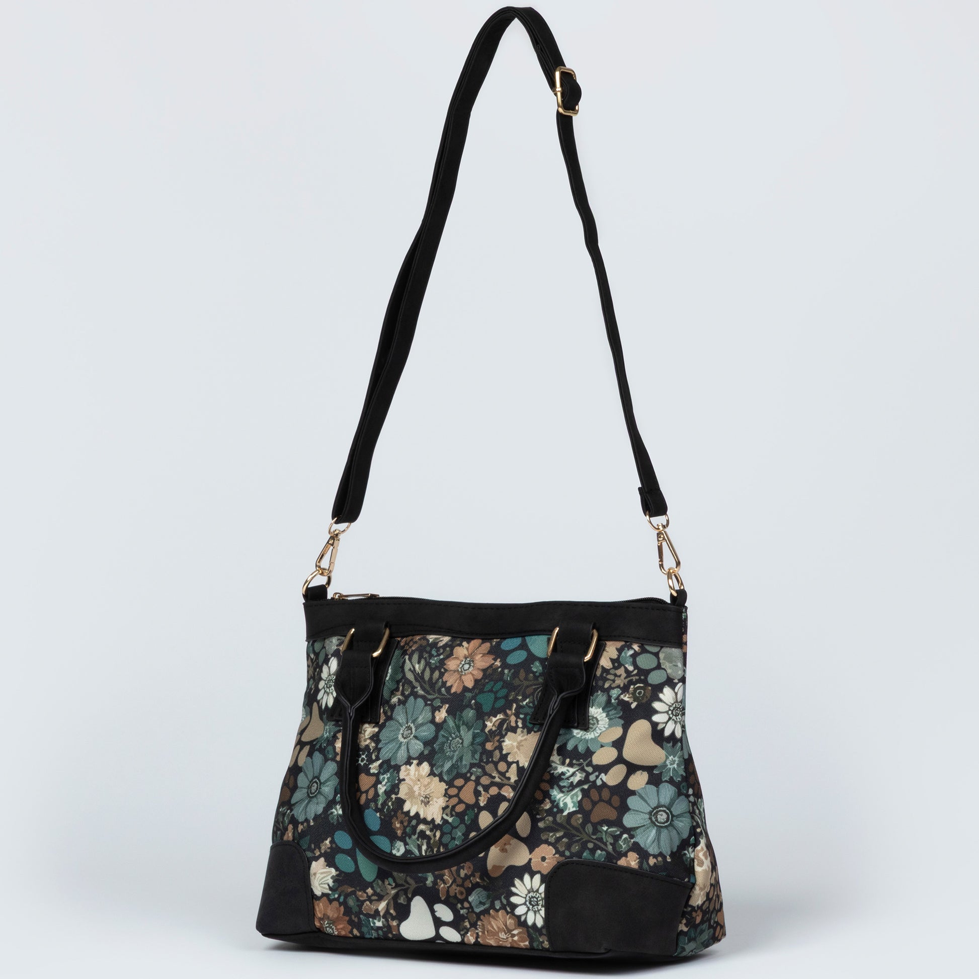 A brilliant blend of casual canvas and structured design in one versatile handbag! Cotton canvas stands up to wear and tear with an everyday appeal, while the black faux leather handles, strap, and corners bring a more structured look. Patterned in paw prints on a black backdrop that proudly share your support of animal rescue causes, and topped with interior and exterior pockets for the perfect amount of organization.
