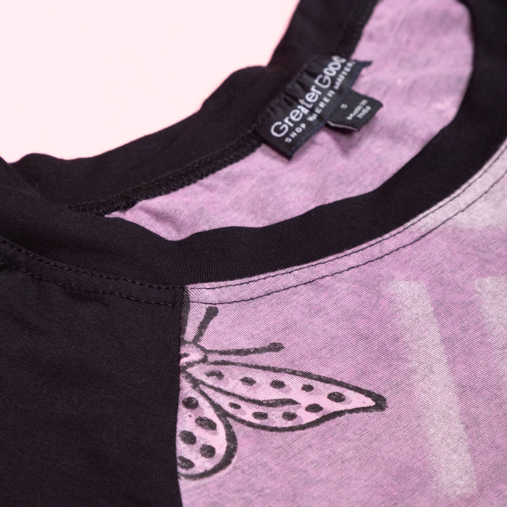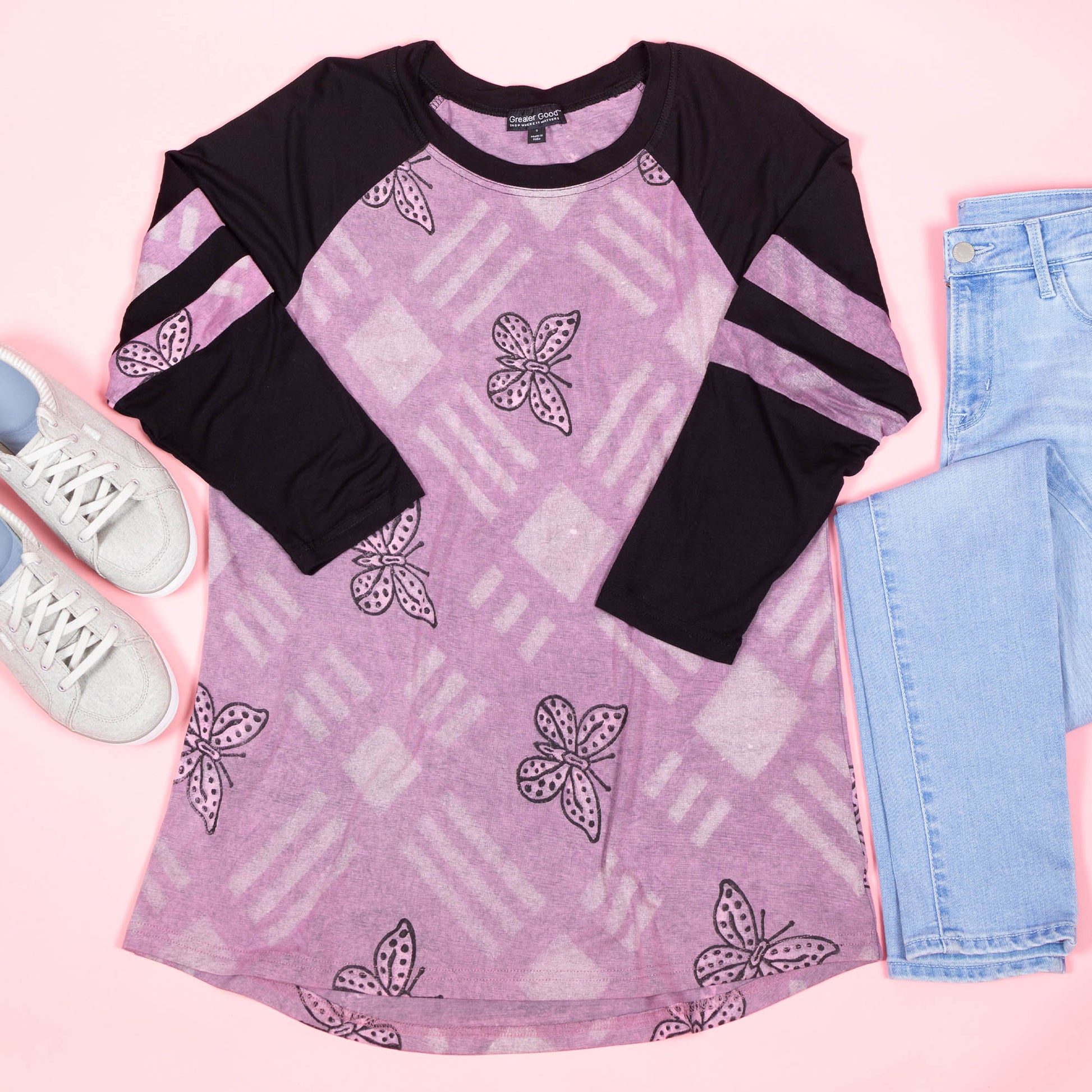 Handprinted butterflies and a geometric print make this lavender and black raglan top both feminine and comfortably casual. Made with stripes on the sleeves with the matching print, a soft viscose blend with a little bit of stretch, and a flattering hi-lo hem!