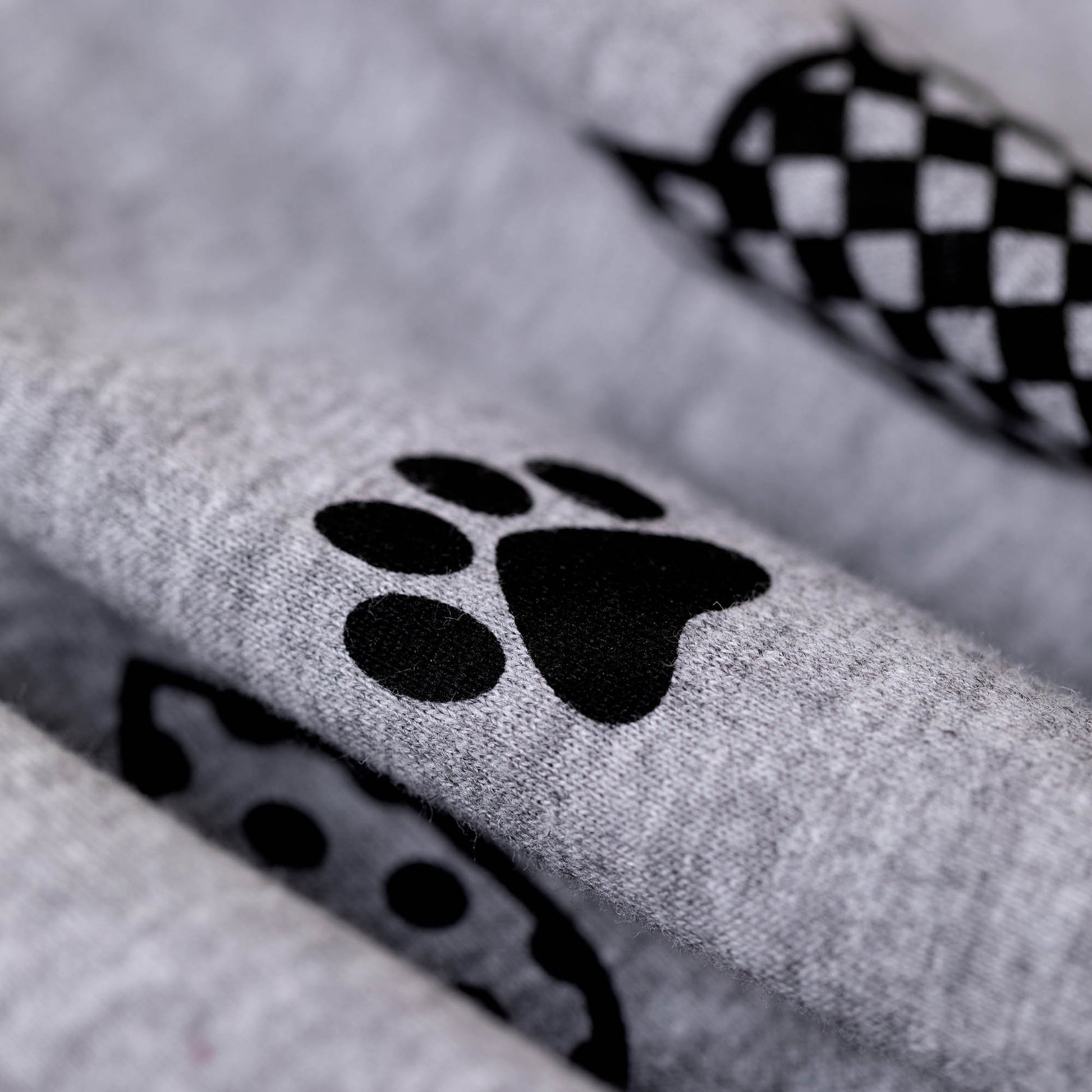Perky-eared silhouettes of dog and cat faces pattern this heather gray v-neck tee. Speckled with paw prints and filled with polka dots and stripes, this casual cotton blend top is cute, comfortable, and overflowing with furry friend charm!
