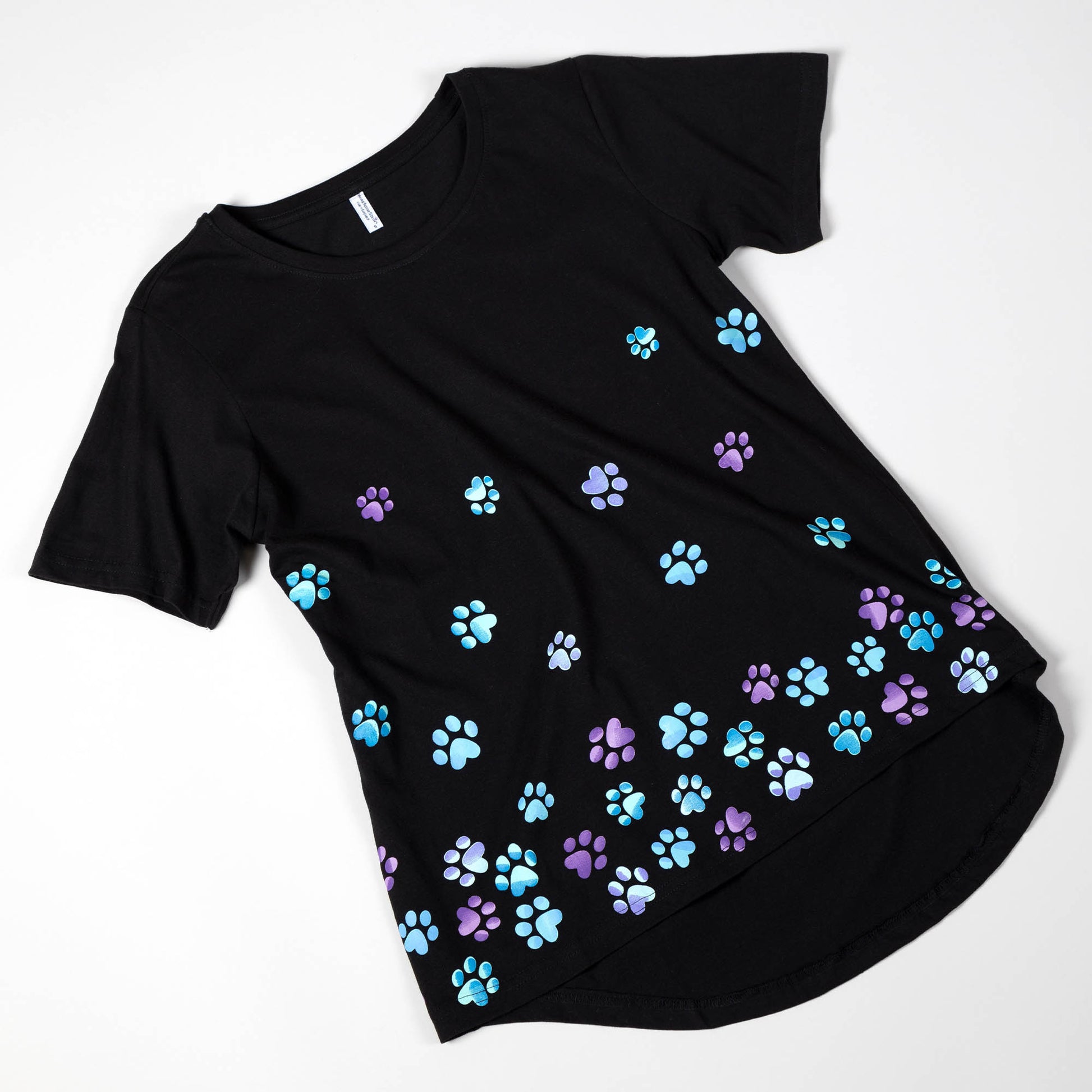 Paw prints in colorful gradient designs tumble down the front of this black crew neck tee. Made with a soft cotton blend, this women's short sleeve t-shirt is topped with a flattering drop tail hem, making it your new favorite animal-friendly top!
