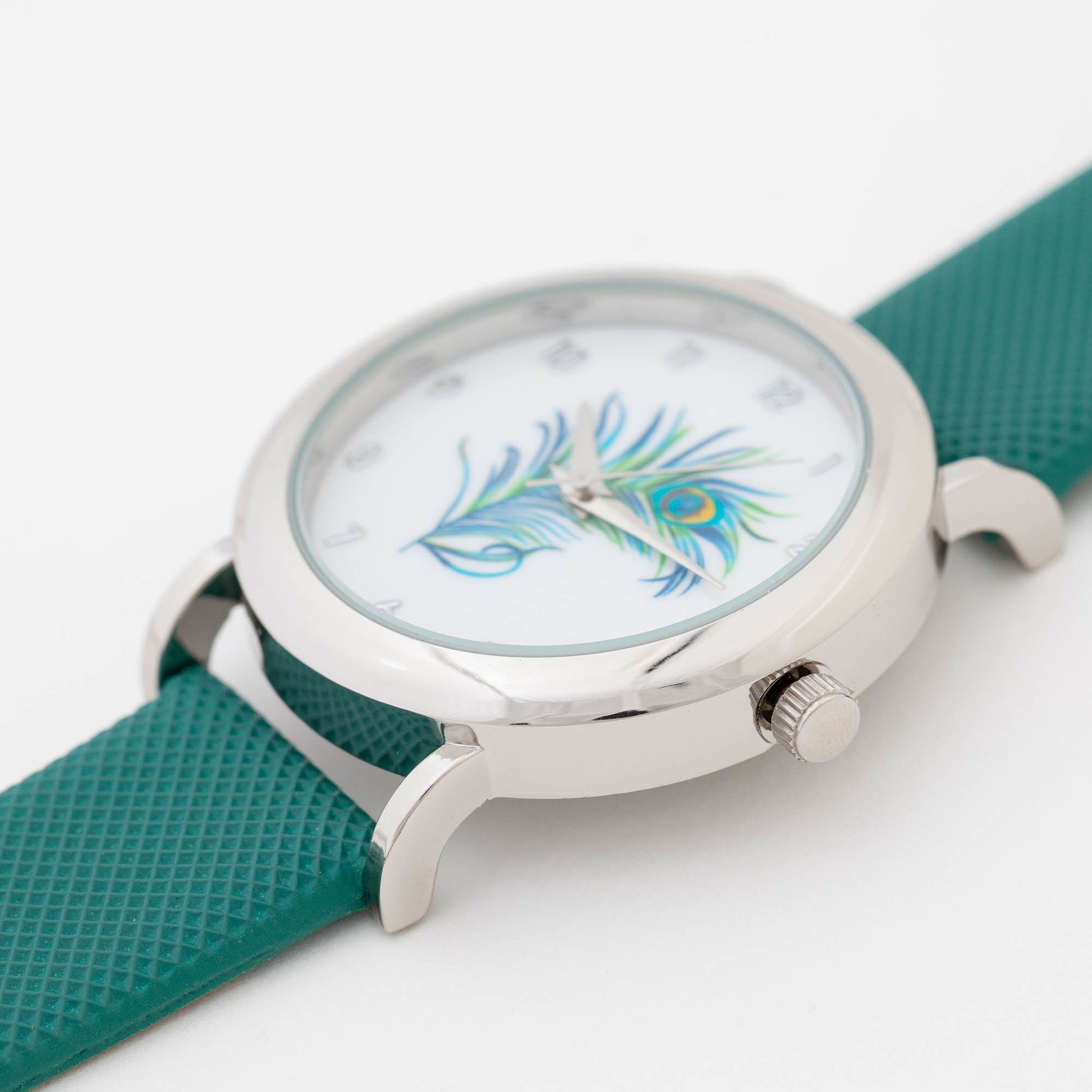 A beautiful peacock feather blows across the center of this classic watch. Made with a silver case surrounding the watch face, and finished with a color coordinating turquoise faux leather strap.