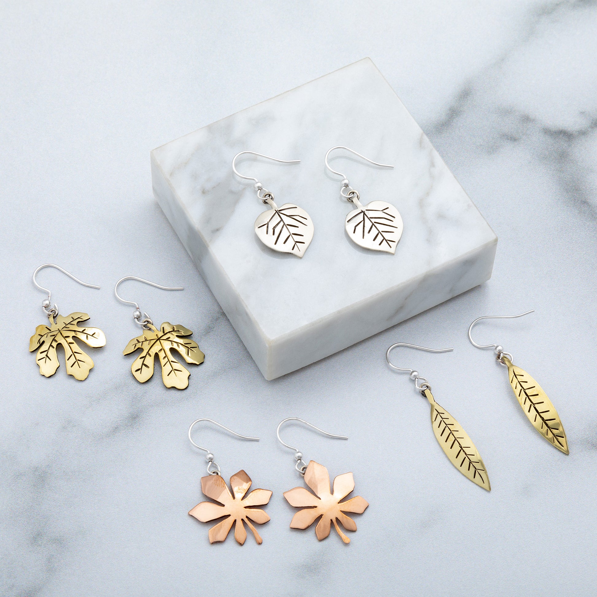 Crafted from mixed metals -- brass, alpaca silver, or copper -- each pair of dangle leaf earrings perfectly portrays an array of gorgeous natural foliage. Made with textured details that are handcrafted by the artisans of Far Fetched who create them, each pair is an homage to the natural beauty all around us!