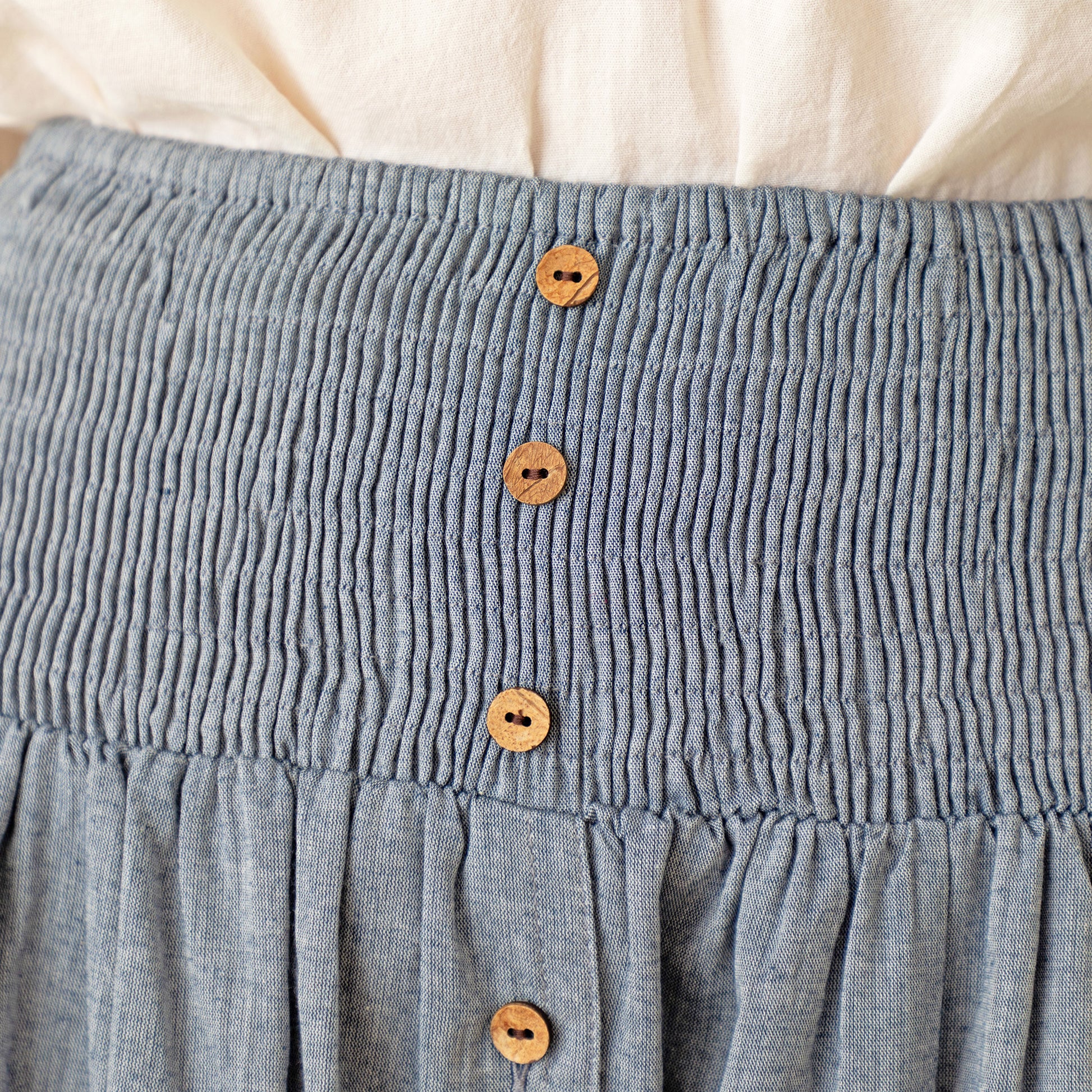 A stylish chambray skirt with a comfortable and flattering fitted elastic waist! Topped with wooden buttons down the front and a tiered fit that brings movement to this incredibly charming piece.