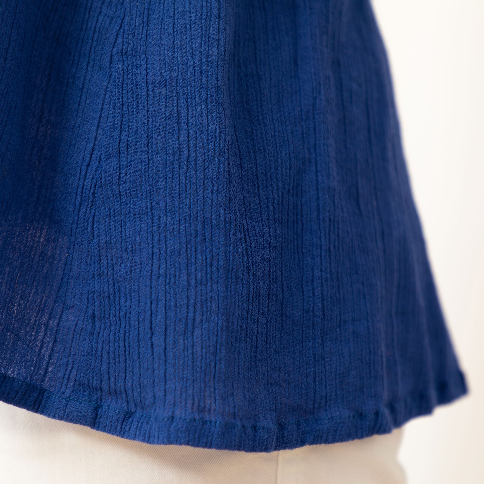 Delicate stitching and beading decorates the collar of this sleeveless top. Hues of pink stitching, contrast elegantly against the royal blue, giving a lovely look.