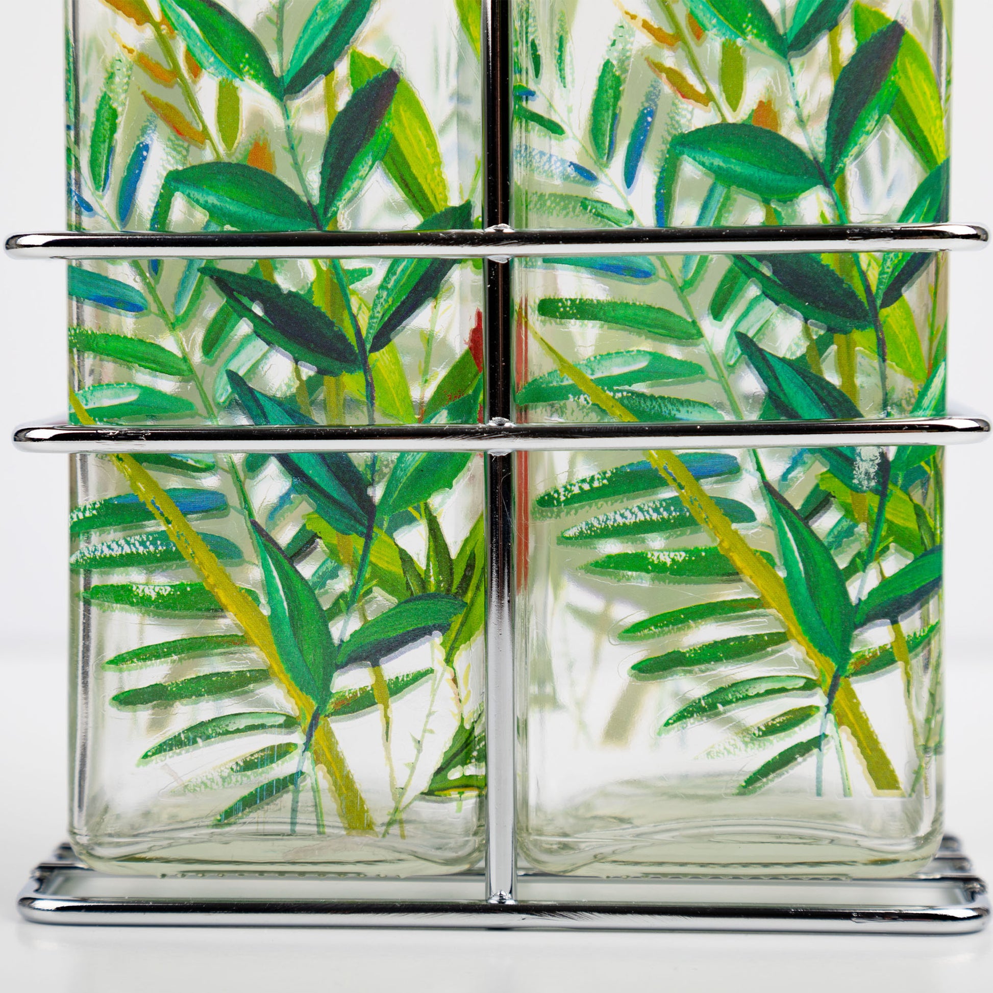 This Oil and vinegar set is well made glass with floral painted designs sits nicely in a metal caddy holder and I especially like the spouts that control the flow of oil and vinegar. Great price too happy I bought this.