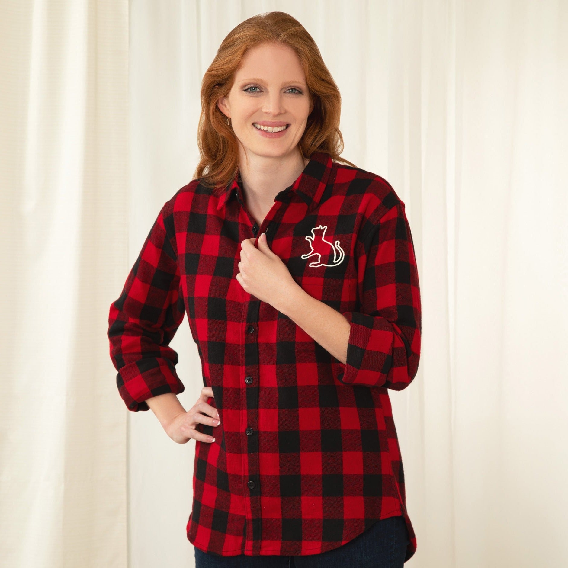 Made of 100% cotton, this plaid shirt is a must for cat and dog lovers alike. With a simple yet sweet silhouette of a cat or dog, your pet pride is front and center. Buttons at the wrist let you have more flexibility when unbuttoned, or button up for a more polished look!