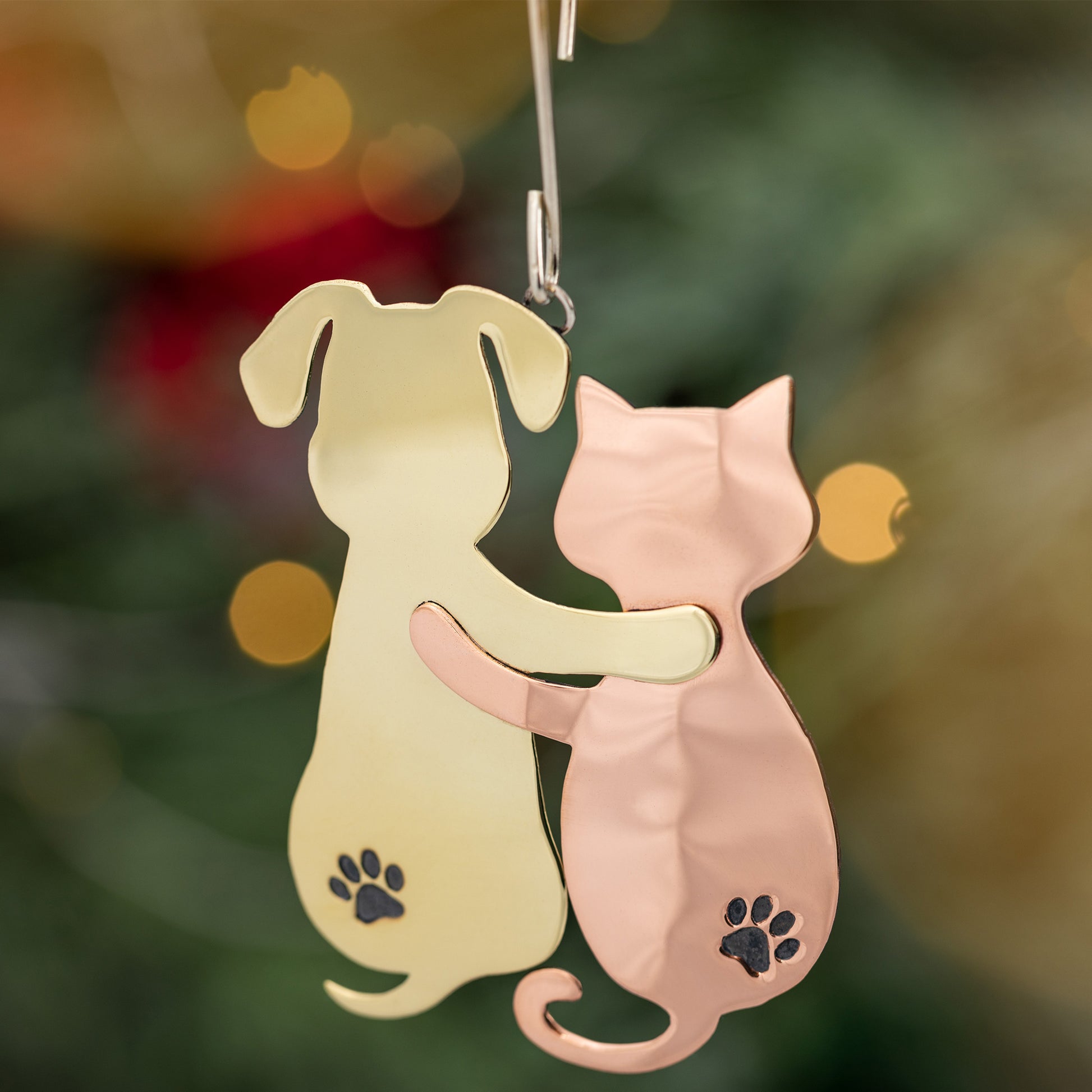 A brass and copper silhouette of a hugging cat and dog is a heartwarming and animal-friendly addition to your tree! Handcrafted by artisans in Mexico, each ornament is a fair-trade part of your holiday home decor.