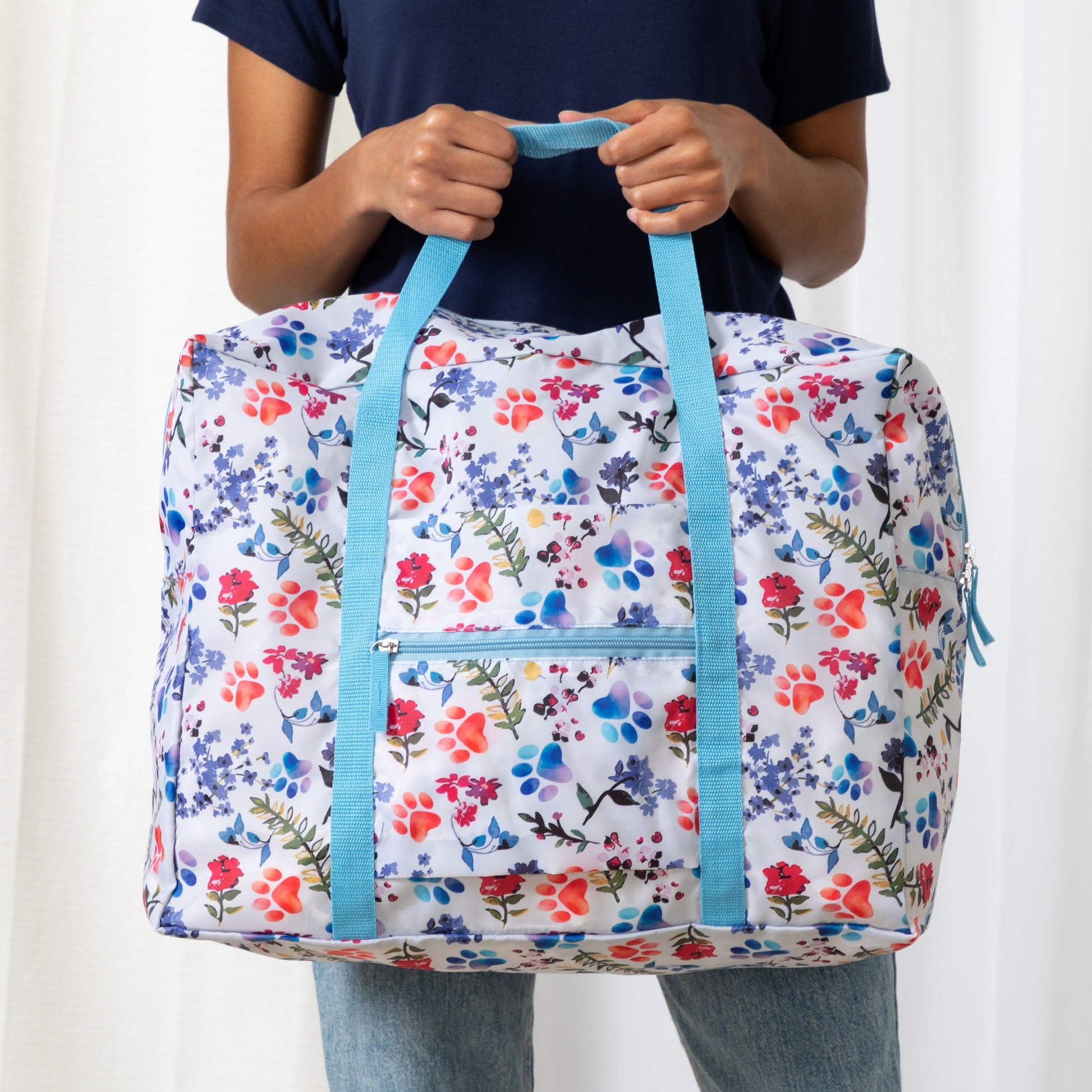 A frequent traveler's must-have duffel! Made with a super lightweight, packable, durable polyester patterned with colorful prints and a front zipper pocket for organized storage. Plus, the trolley sleeve on the bag makes it easy to loop onto your suitcase handle while you're on the move!