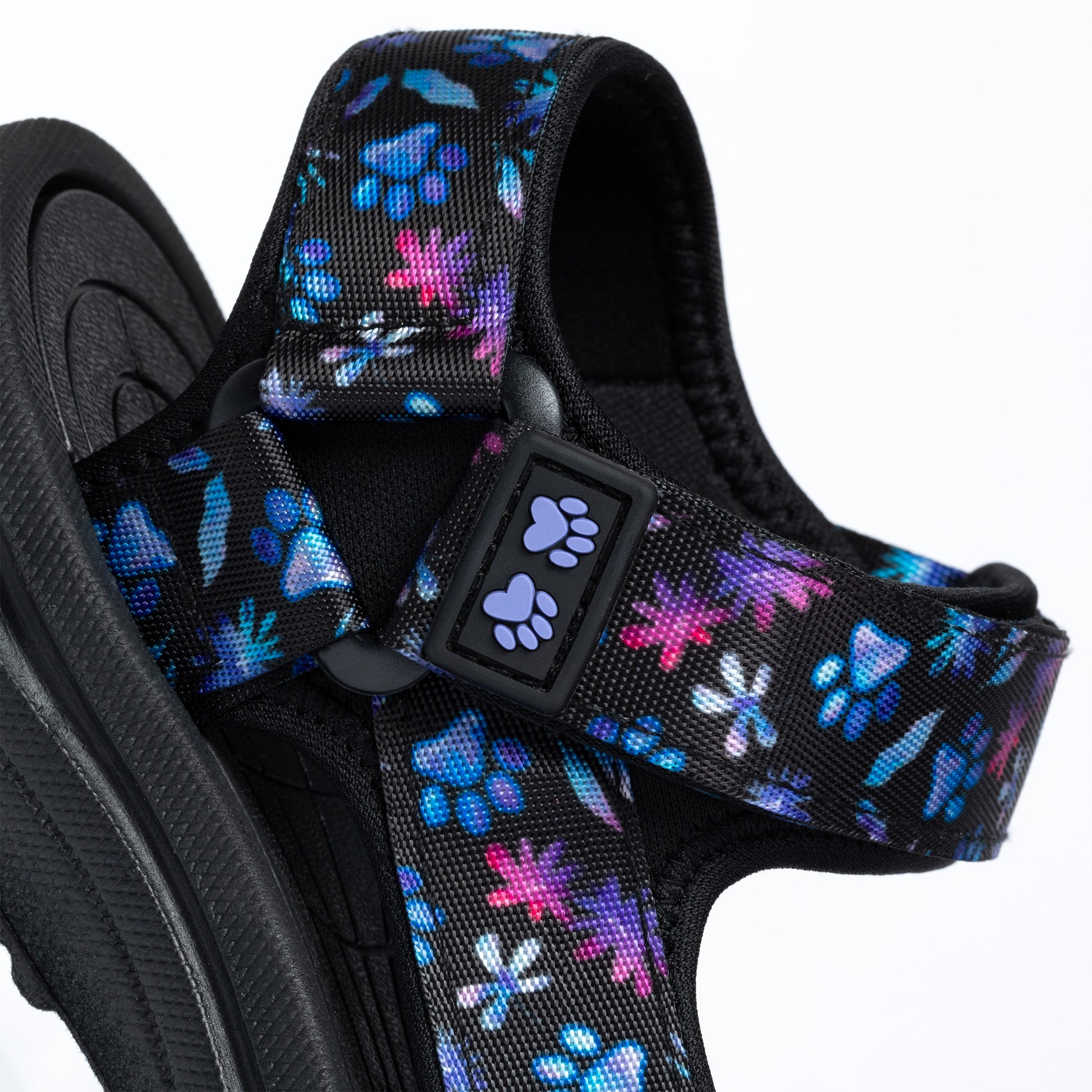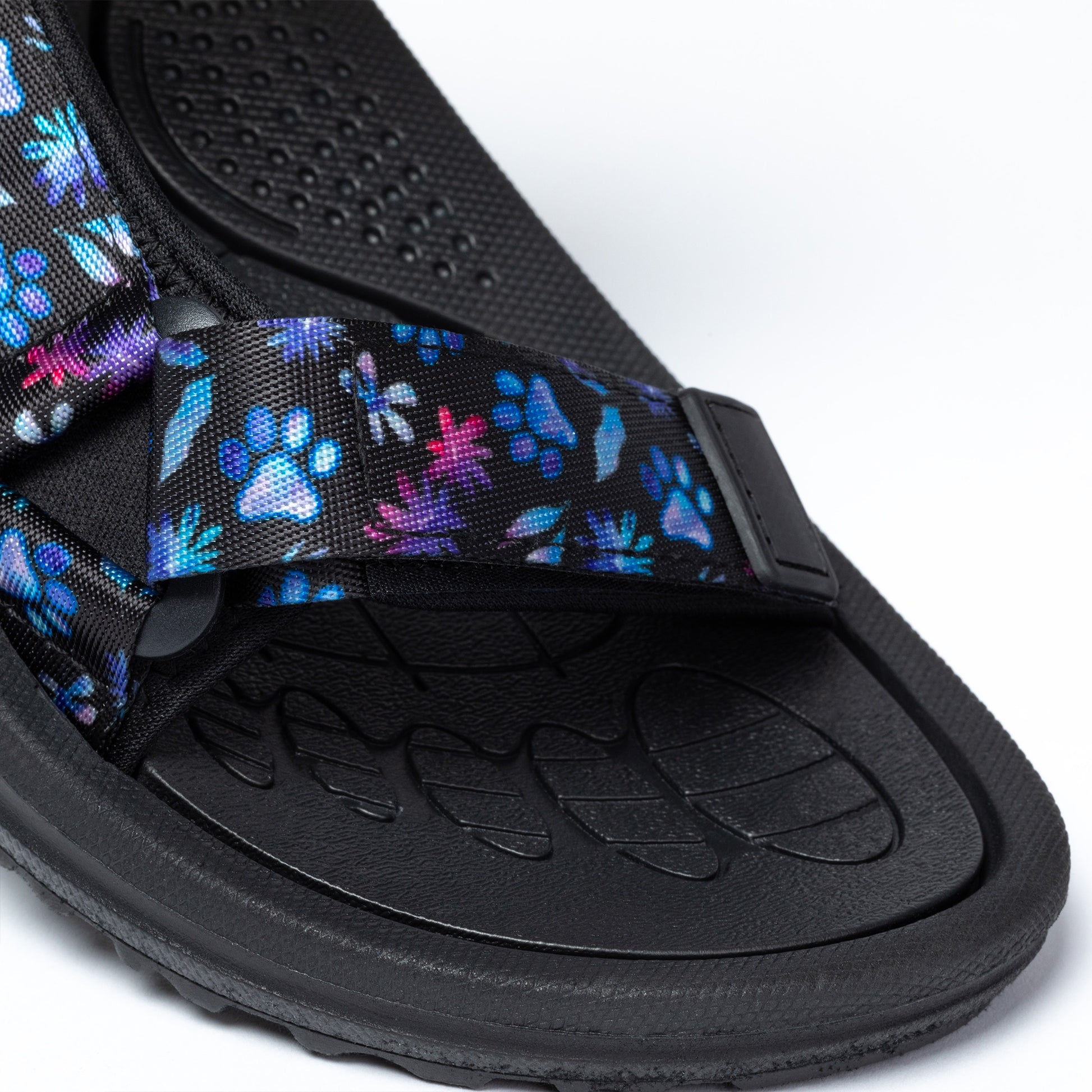 You already have paw prints on your heart, and now you proudly wear them down to your toes! Bright, woven straps keep your feet securely in place in this rugged pair. The straps are easily adjustable with a heel cushion for comfort and two purple paws on the end of the Velcro tab -- further displaying your animal affection!