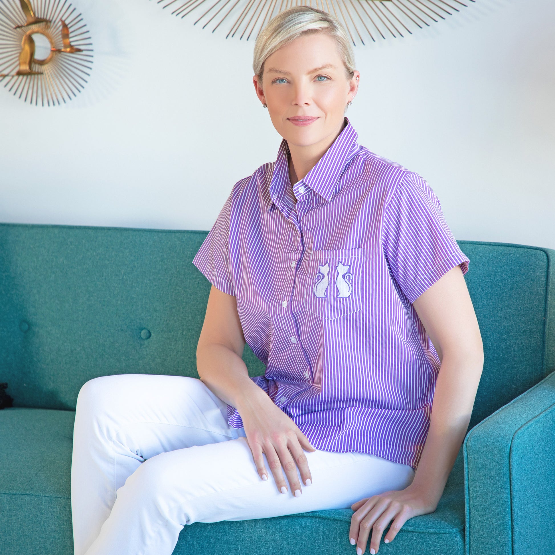 Purple or blue pin striped, this short sleeve shirt with a left chest pocket can be buttoned up or left open to create two different looks. Embroidery on the chest pocket displays paw prints, hearts & paws or cats to showcase your love and support of animals.
