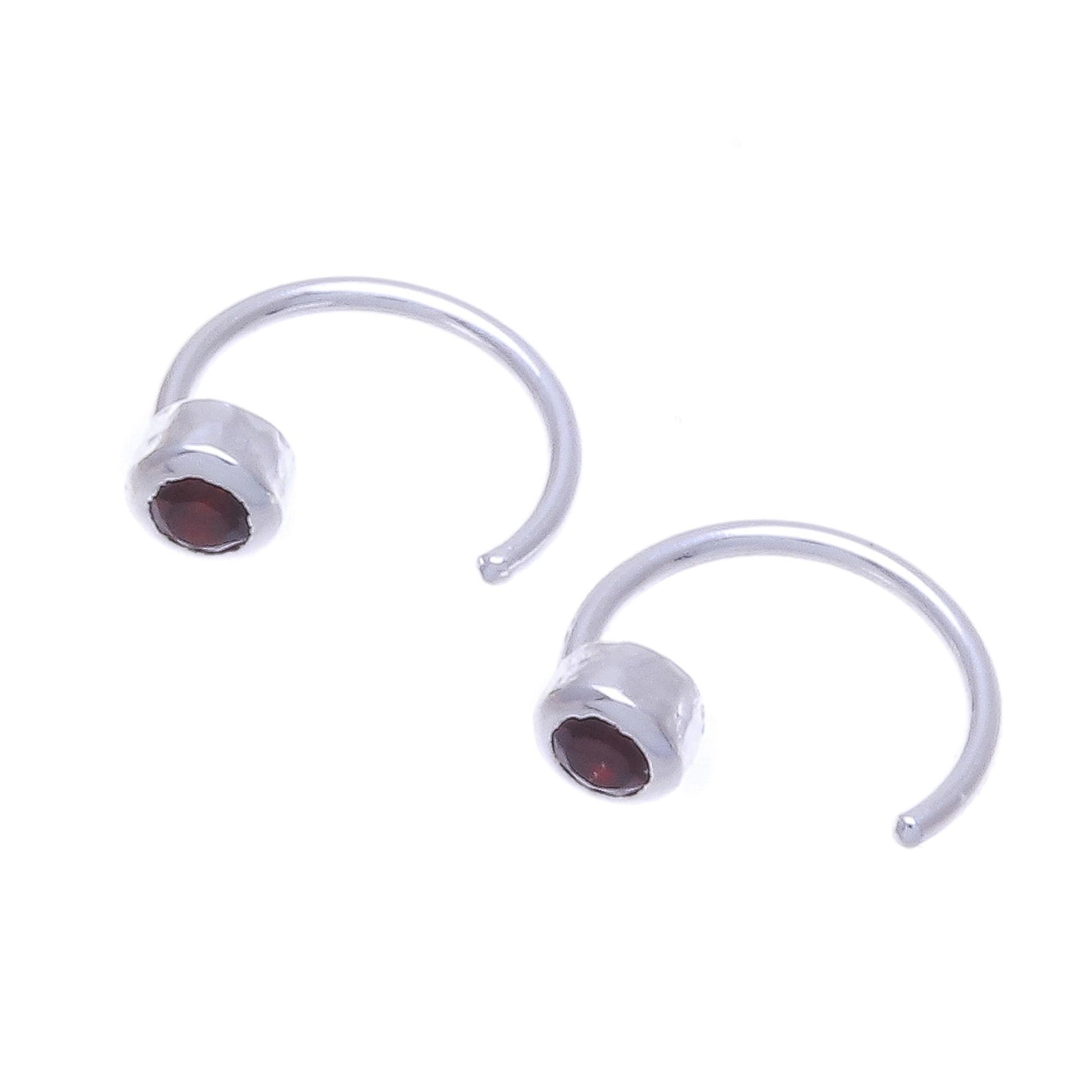 Always creative, Jantana crafts a delightful pair of earrings with half hoops that curve from back to front. The petite sterling silver pair showcases natural garnets and is perfect for office wear, casual times and dressier occasions.