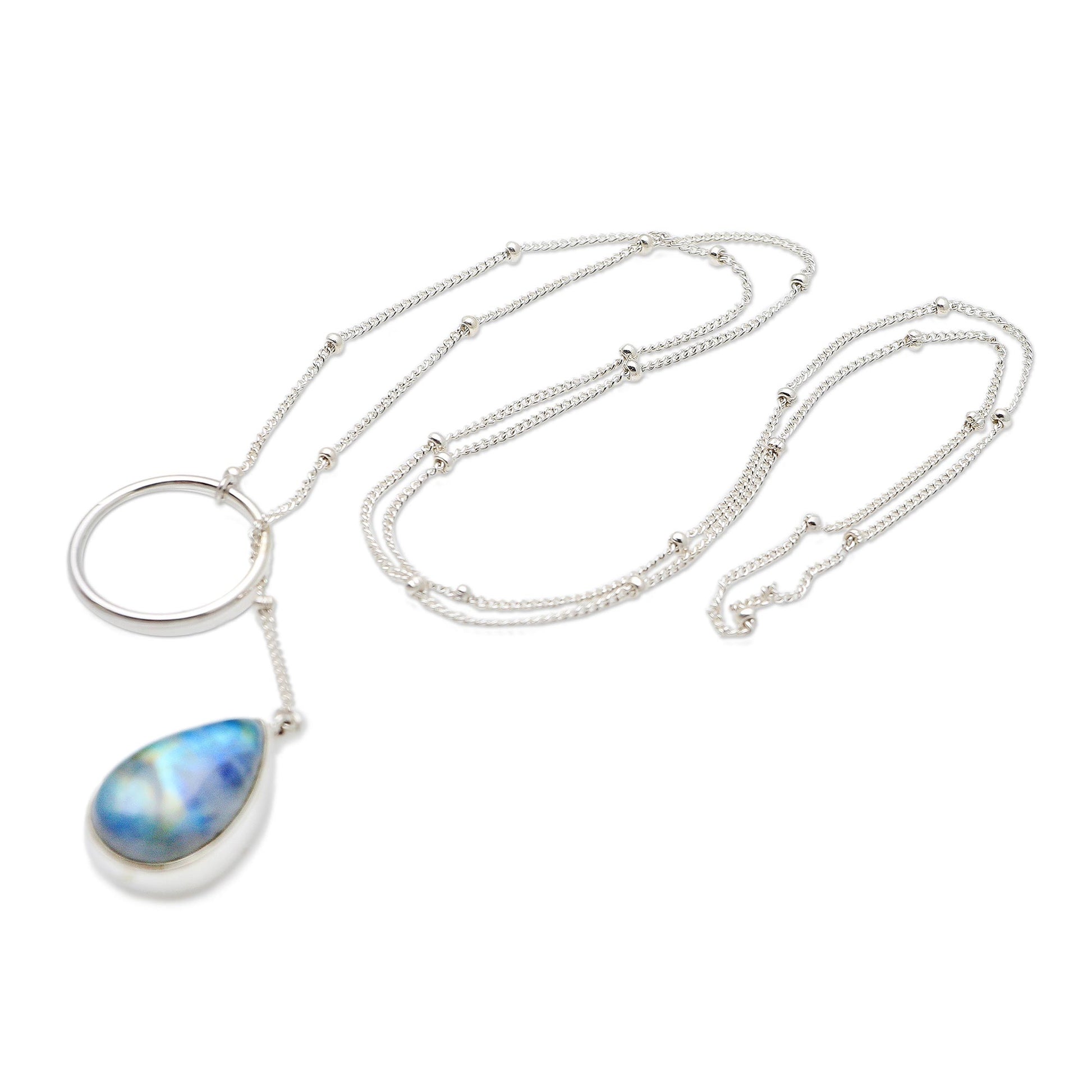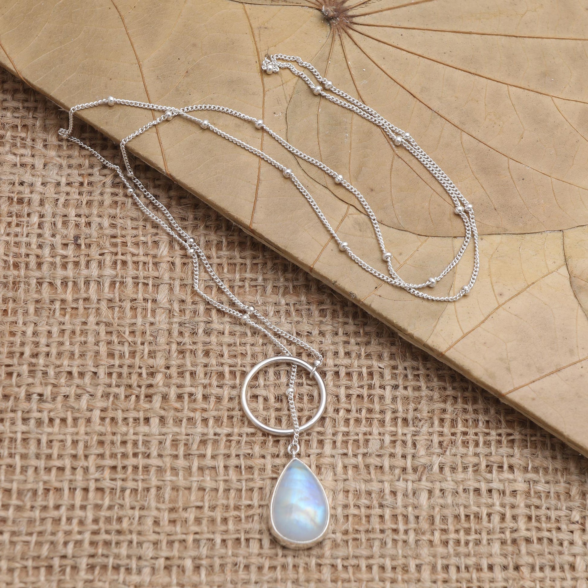 Inspired by the beauty of rain, Bali's Ari Gunawan created this iridescent necklace with a drop-shaped pendant. The pendant, a shimmering rainbow moonstone in a bezel setting, hangs from the end of a sterling silver Cuban link chain and loops through a silver hoop to close.