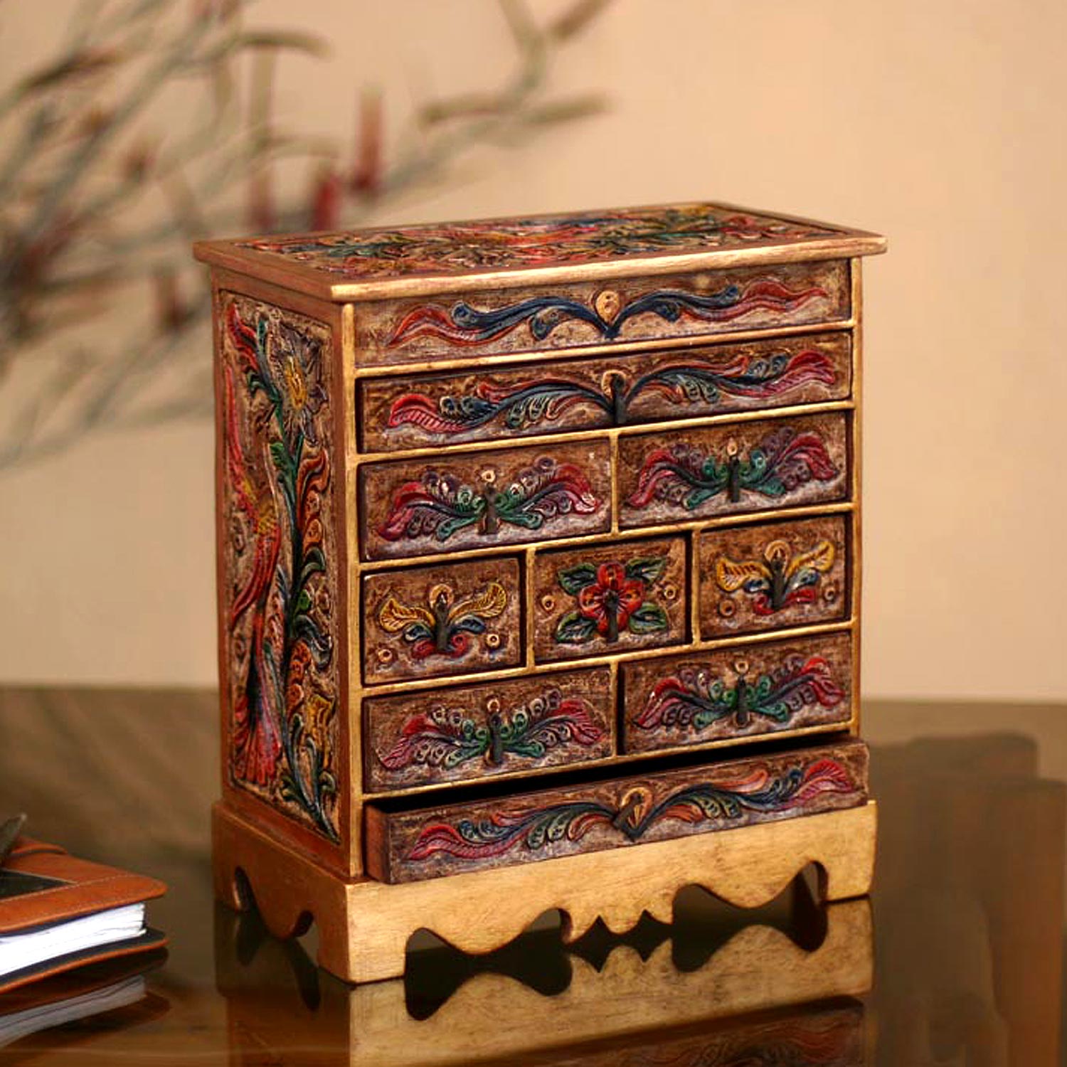 Oscar Pastor crafts this jewelry box from wood and covers it in polychrome leather with an antique finish. A hummingbird hovers amid flowers to feast on their sweet nectar. Portrayed in burnished tooled leather, the graceful images adorn a diminutive chest of drawers for keepsakes and treasures. The drawers open with wrought iron pulls, and a mirror is set inside the lid.