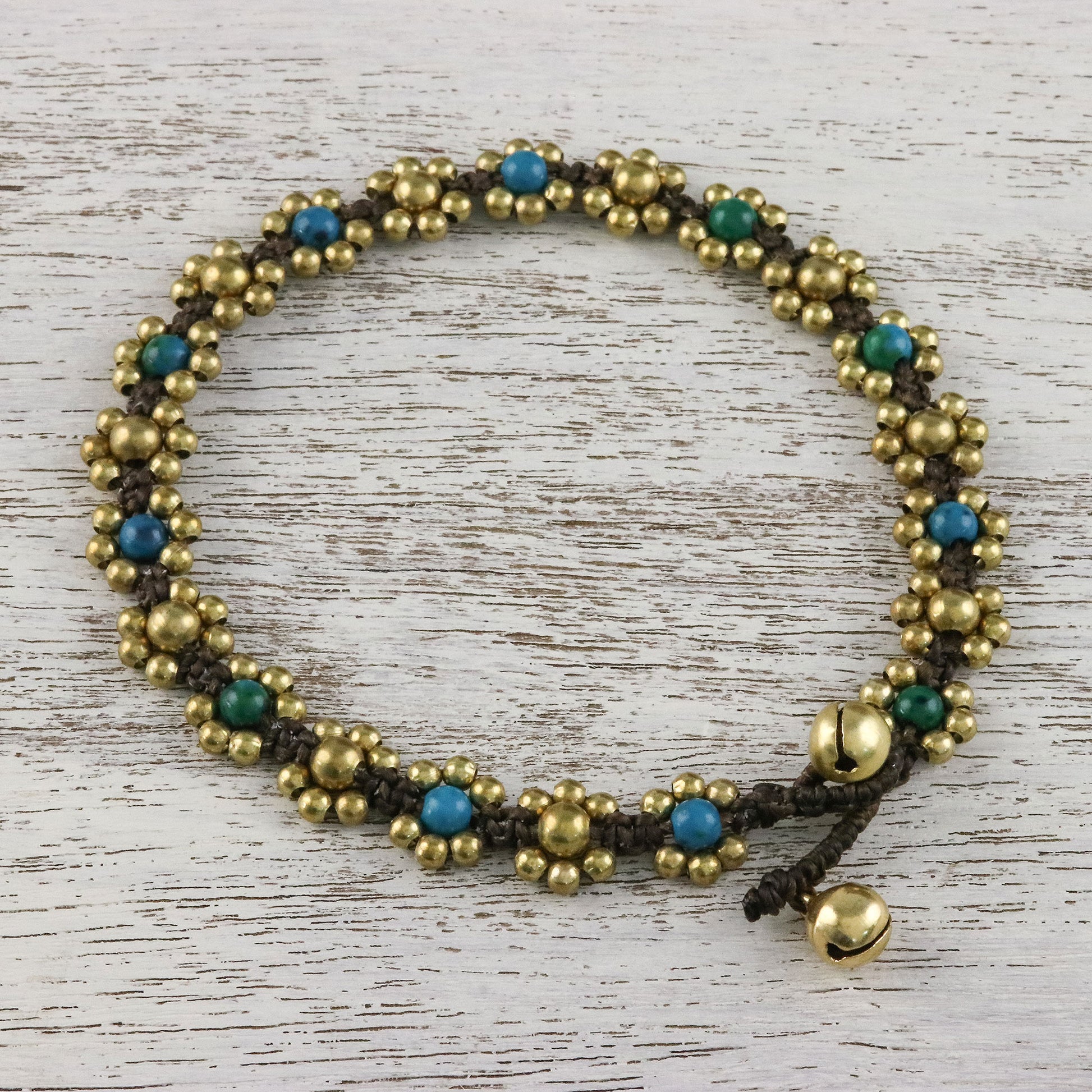 For a dreamy accessory, this anklet is designed by Thai artisan Tiraphan Hasub. She selects stones of blue-green serpentine, beading them alongside gleaming brass to circle the ankle. This accessory closes with an adjustable button clasp with bells that ring musically.