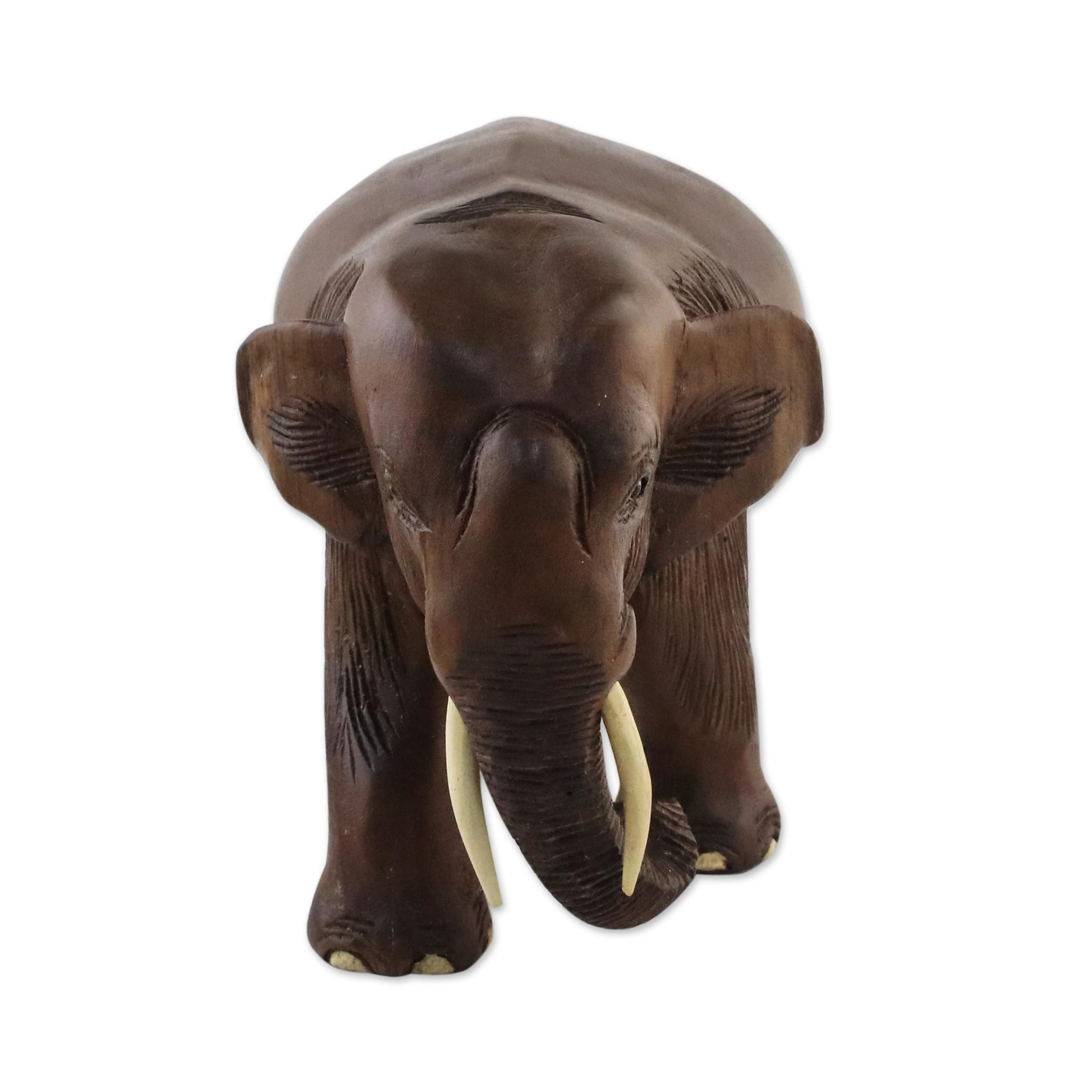 An elephant is surely one of the most fascinating animals you could hope to see, if you were to take a trip into the wilds of Africa or Asia. This statuette from Thailand's Amporn captures the wisdom and amiable nature of an elephant with its open eyes that look right at you. In addition to the rich brown color of the teakwood and luminous ivory darabela wood tusks, the wrinkles on its skin add texture and realism.